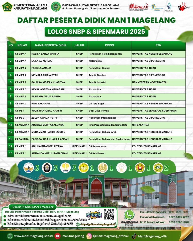 Magelang, 24 Juni 2025 — Prestasi membanggakan kembali diraih oleh peserta didik MAN 1 Magelang dalam ajang Lomba Cerdas Cermat Islam (LCCI) tingkat Provinsi Jawa Tengah. Tim MAN 1 Magelang yang terdiri dari Nizar . . . 0